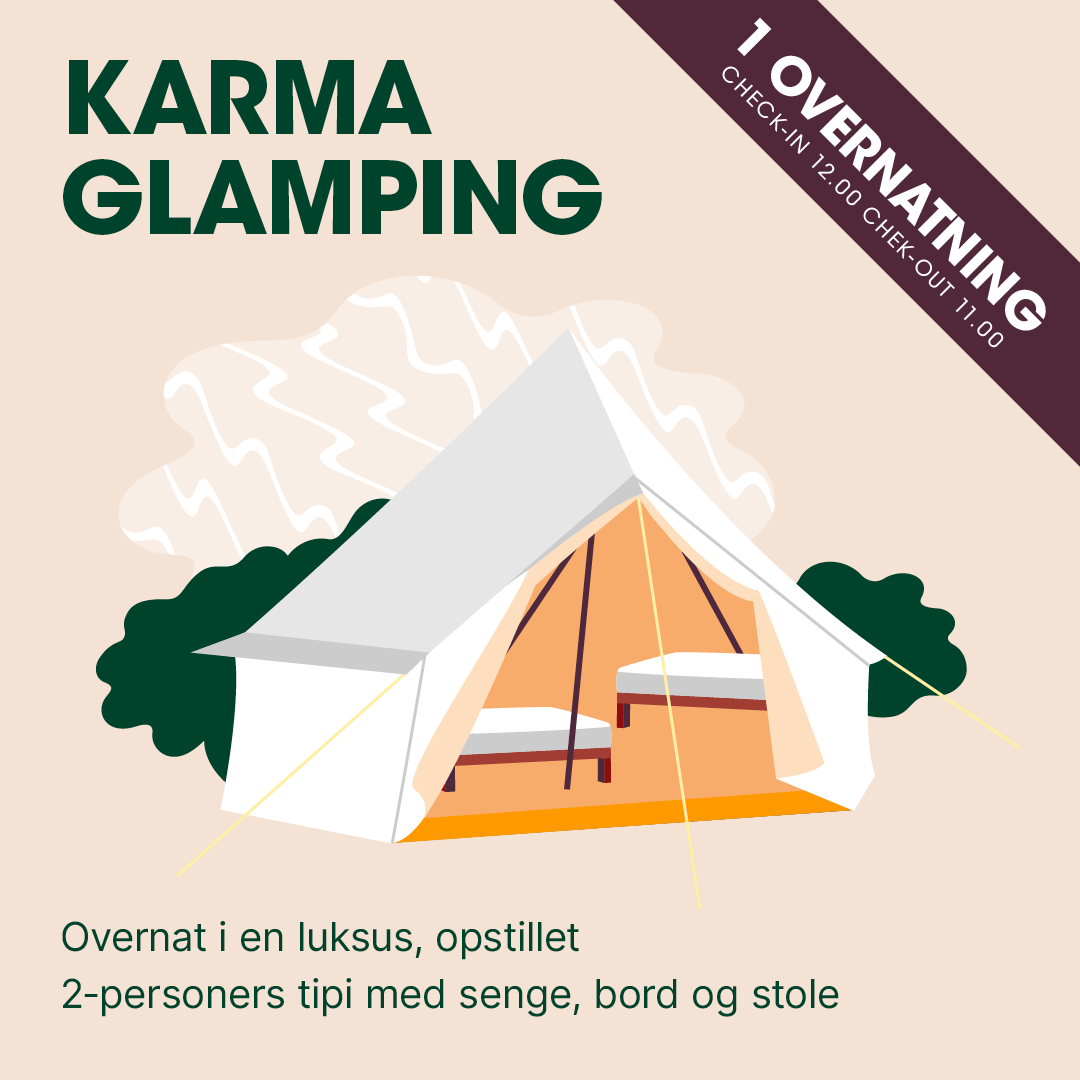 Karma Glamping er et unikt campingområde på Karma, hvor du bor i store og rummelige tippitelte, der skaber en hyggelig atmosfære og giver dig en mere komfortabel festivaloplevelse. Teltene fås i en 2-personers udgave og alt står klar, når du ankommer!